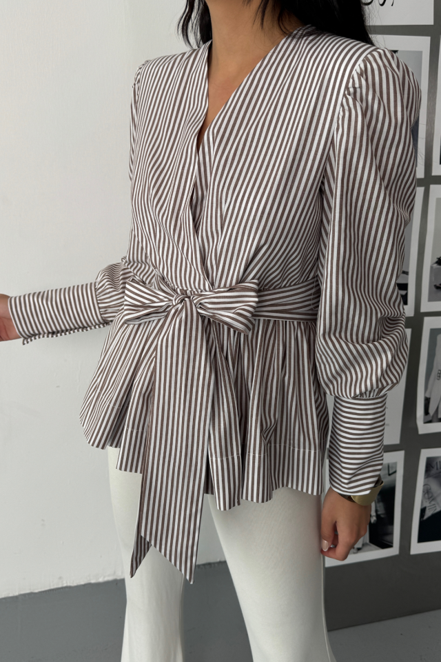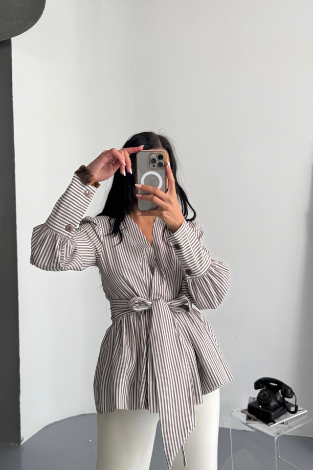 ÇİZGİLİ BAĞLAMA DETAYLI KRUVAZE POPLİN GÖMLEK – Kahverengi