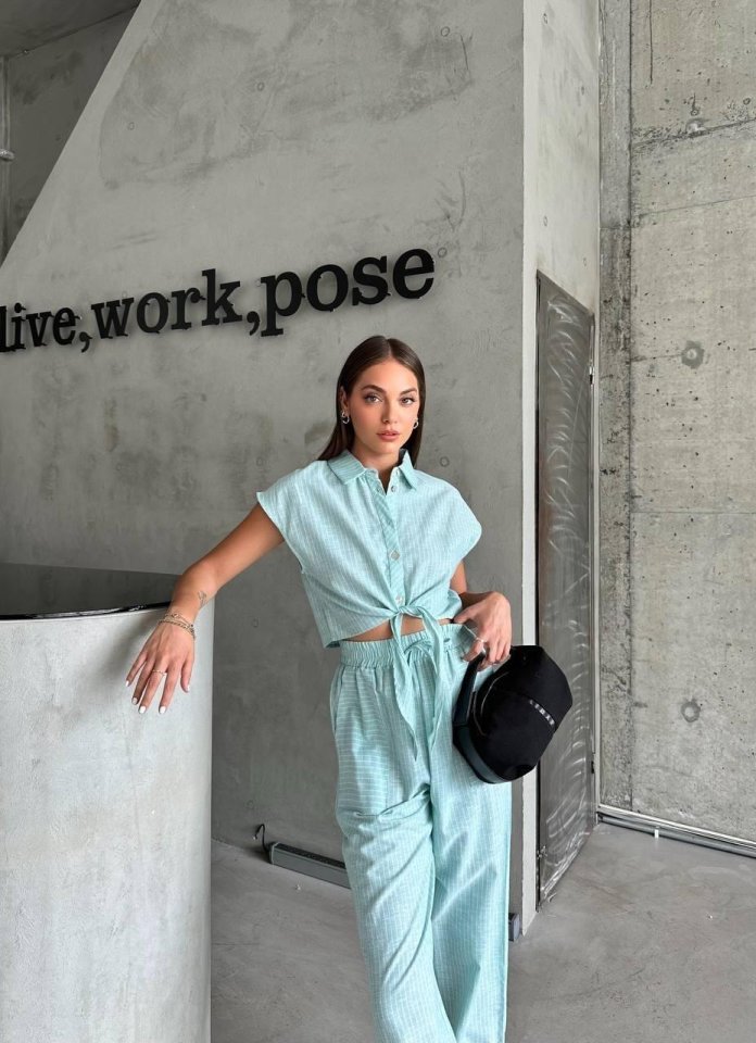 ÇİZGİLİ KETEN KOLSUZ CROP PANTOLON TAKIM – Yeşil