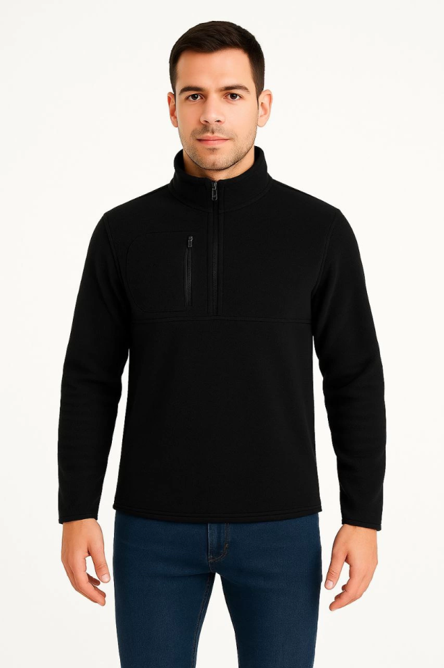 Erkek Polar Kazak – Dik Yaka, Yarım Fermuarlı, Fermuarlı Göğüs Cepli, Siyah Biyeli, Kışlık Rahat Regular Fit Günlük Model