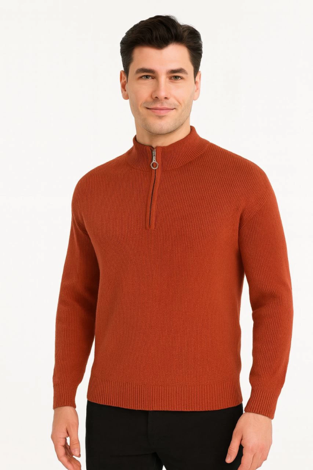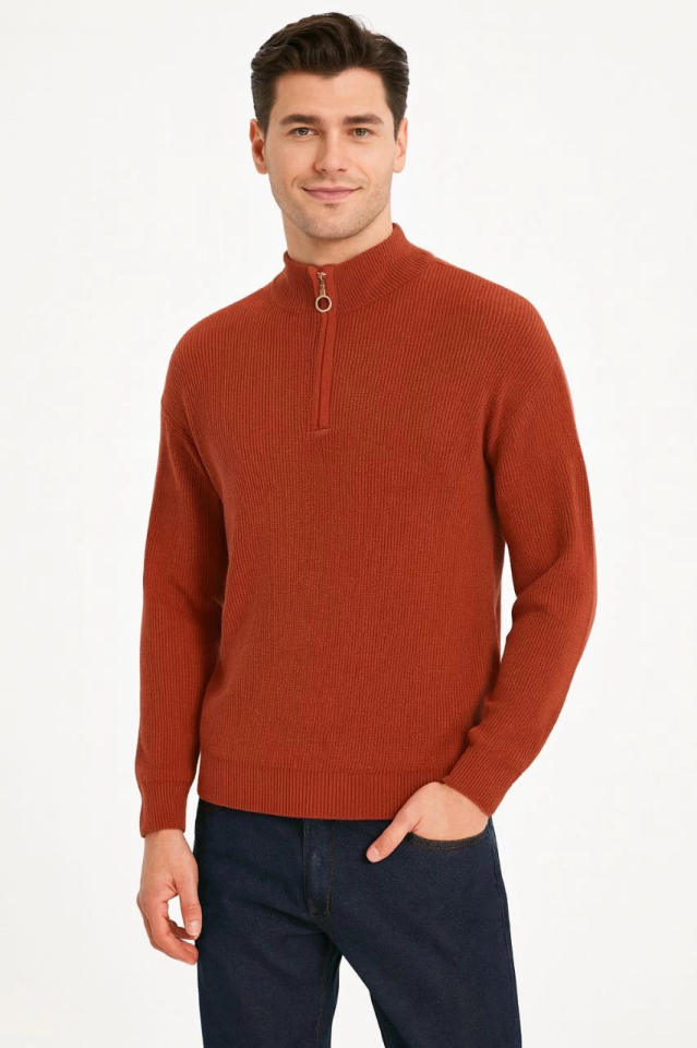 Erkek Yarım Fermuarlı Triko Kazak – Selanik Örgü, Dik Yaka, Pamuklu Dokuma, Regular Fit Uzun Kollu Kışlık Model – Kiremit