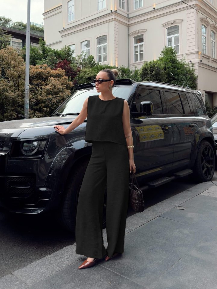 Kadın Bisiklet Yaka Kolsuz Bluz Ve Bol Paça Aerobin Kumaş Ikili Takım