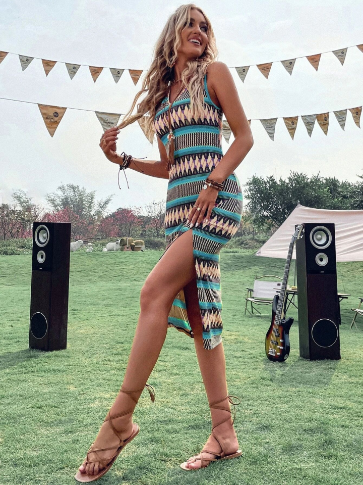 Kadın çok Renkli Yırtmaçlı Dizde Süprem Elbise