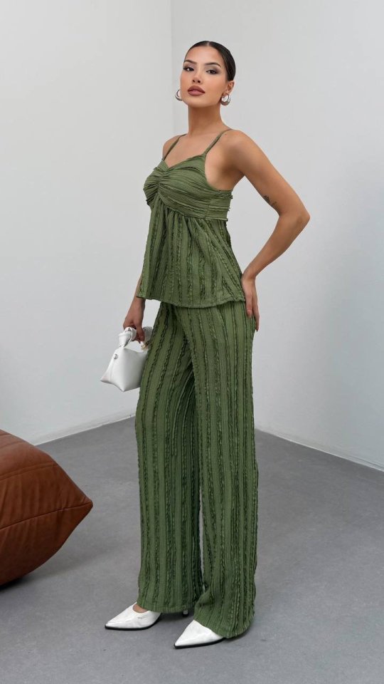 Kadın Haki Dokulu Askılı Üst Ve Bol Paça Pantolon 2’li Takım