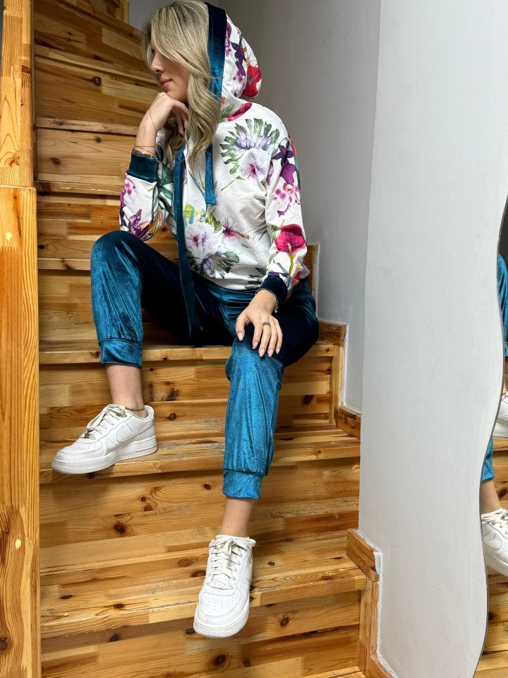 Kadın Kadife Kumaş Uzun Kollu Kapüşon Detay çiçek Baskılı Sweat Ve Pantolon Ikili Takım