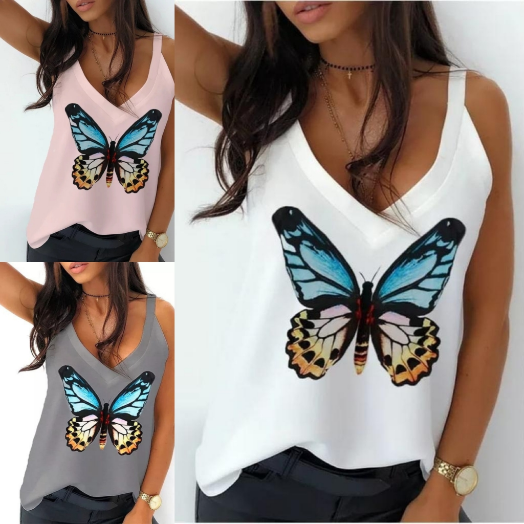 Kadın Kelebek Baskılı Sandy Kumaş Askılı Bluz