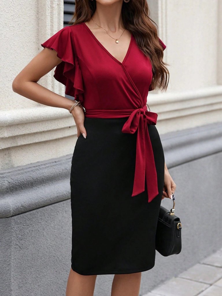Kadın Kısa Kelebek Kollu Kruvaze Yakalı çift Renkli Kuşaklı Ithal Krep Elbise