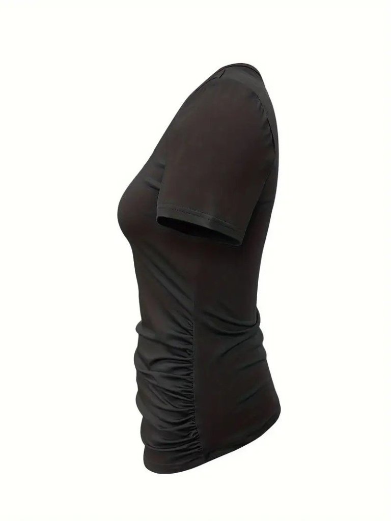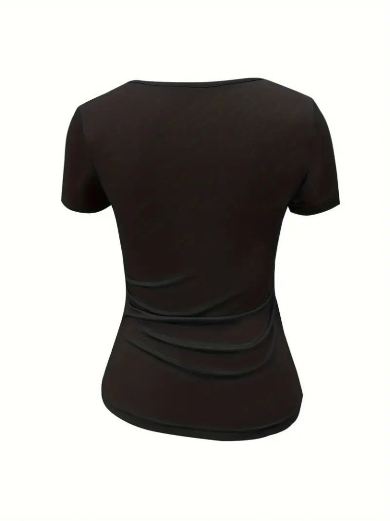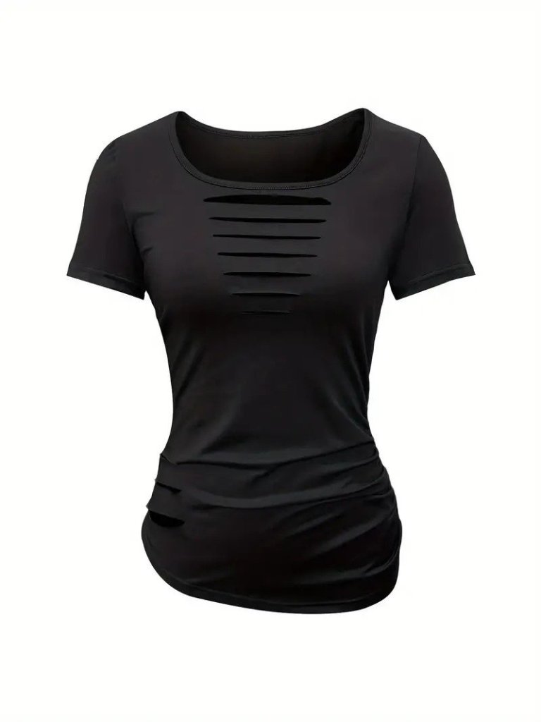 Kadın Kısa Kollu Yakası Açık Lazer Kesik Detaylı Viskon Bluz