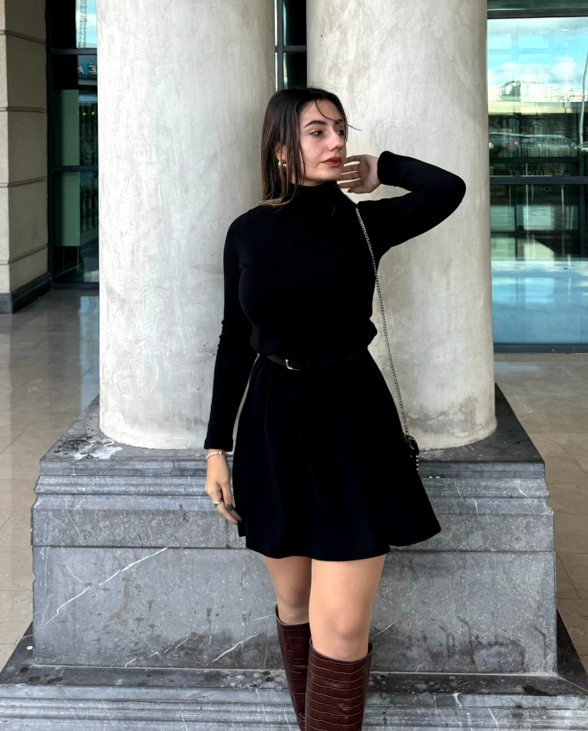 Kadın Uzun Kollu Balıkçı Yaka Salaş Kusa Akrilik Elbise