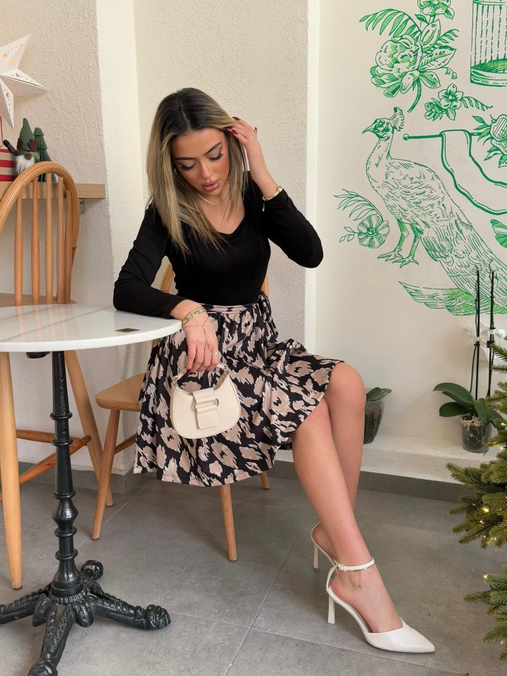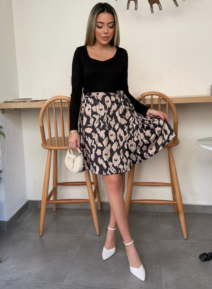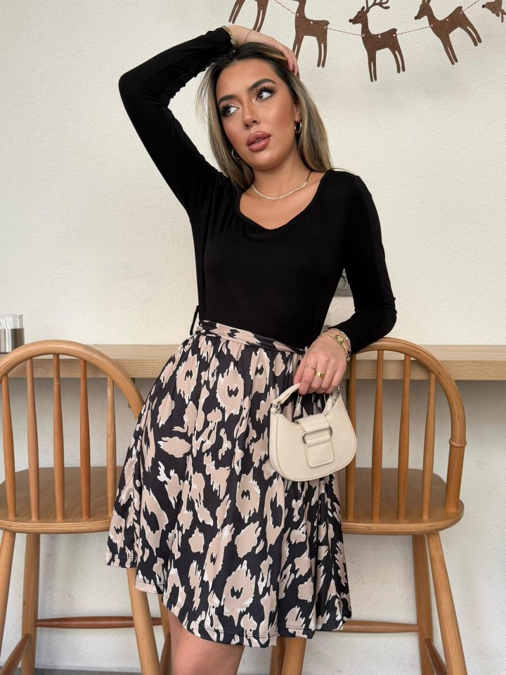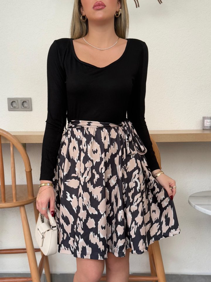 Kadın Uzun Kollu Kare Yaka Viskon Bluz Alt Süprem Baskılı Belden Kuşaklı Kısa Elbise