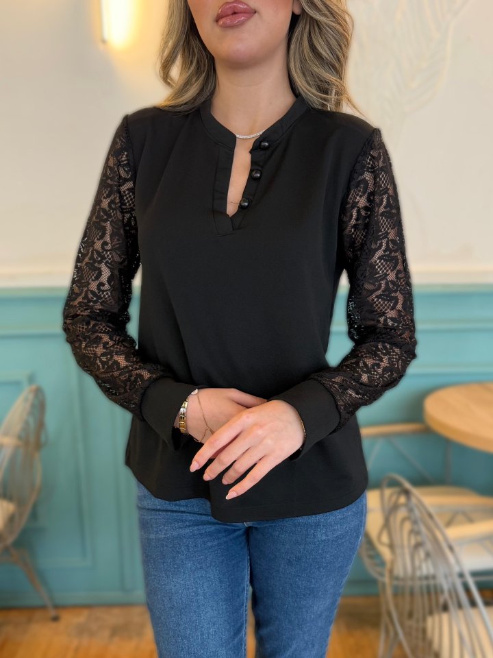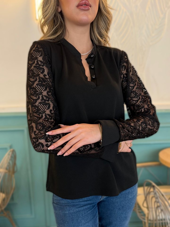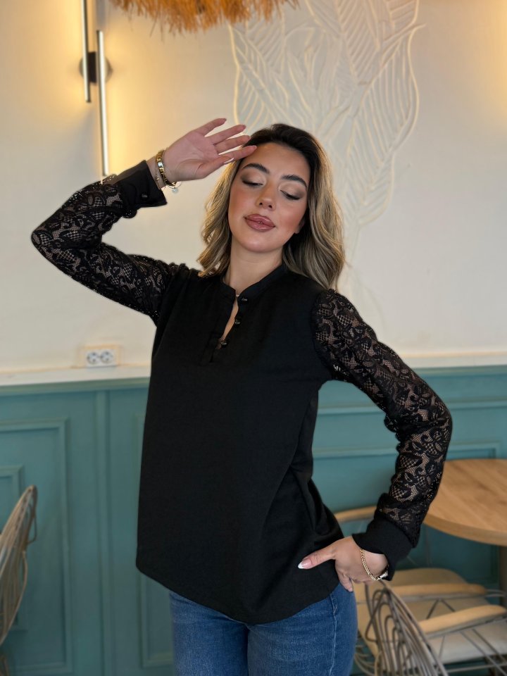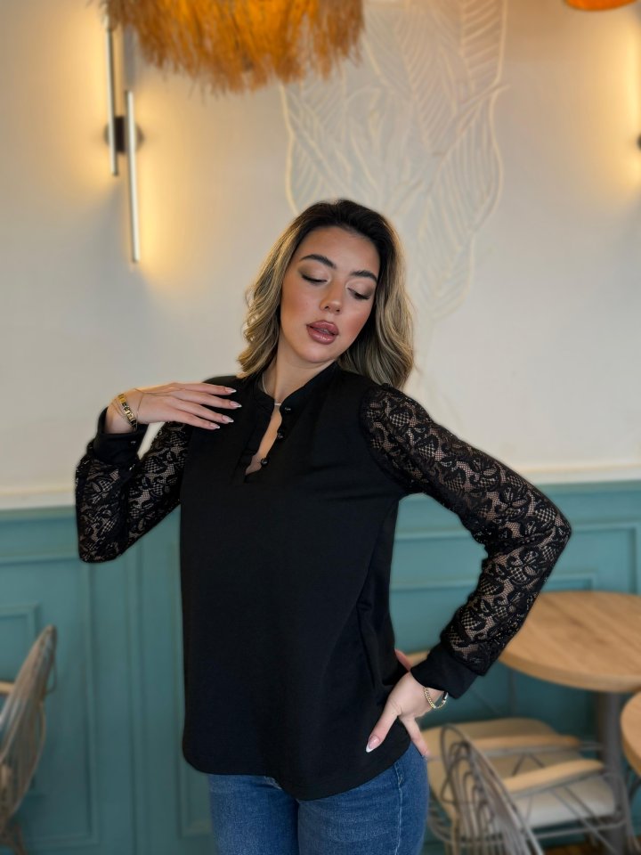 Kadın Uzun Kollu Kolları Dantelli Hakim Yaka Krep Bluz