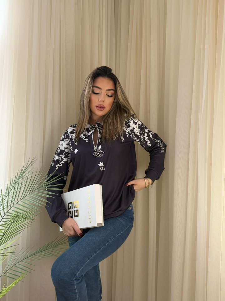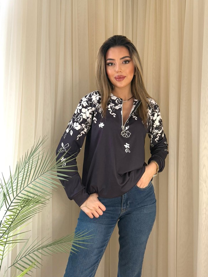 Kadın Uzun Kollu önden Fermuarlı çiçek Desenli şardonlu Dalgıç Bluz