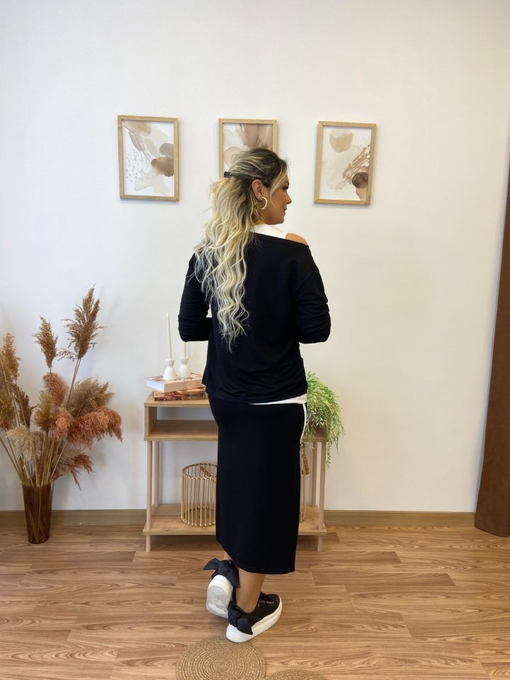 Kadın Uzun Kollu Tek Omuzu Açık Viskon Bluz Içi Atletli Ve Yandan şeritli üçlü Viskon Ikili Takım