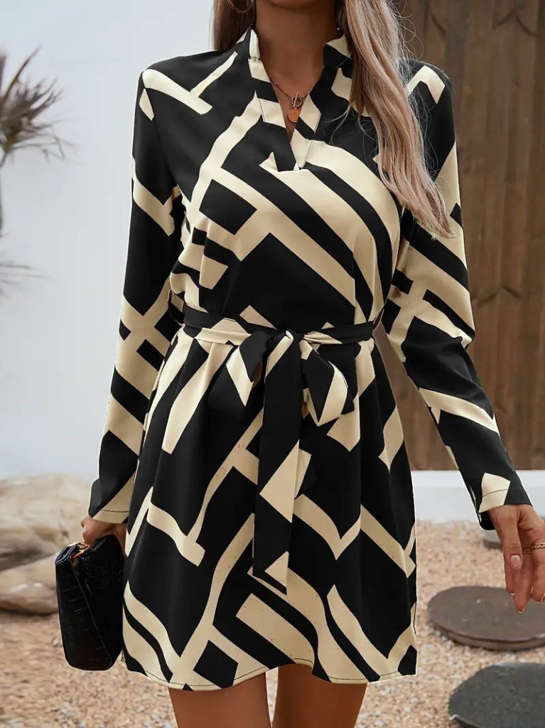 Kadın Uzun Kollu V Yakalı Desenli Belinde Kuşaklı Dalgıç Elbise