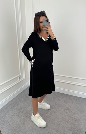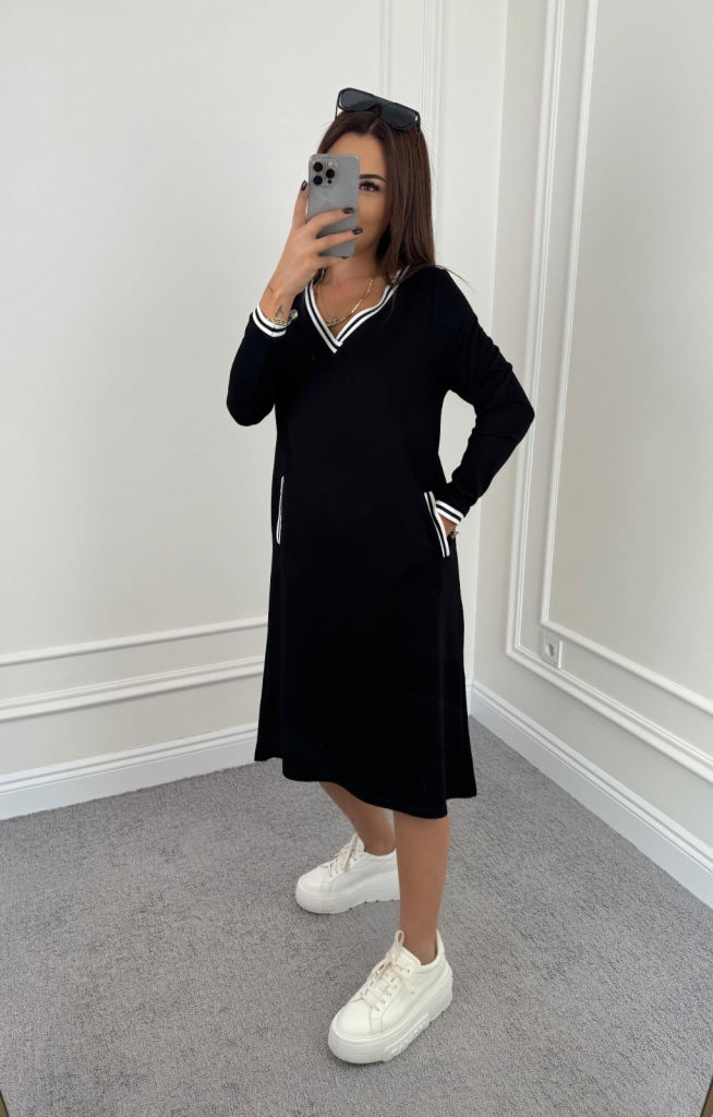 Kadın Uzun Kollu V Yakalı şerit Detaylı Cepli Midi Viskon Iki Iplik Elbise