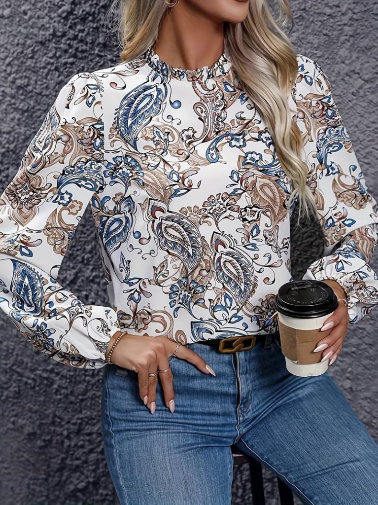 Kadın Uzun Kollu Yarı Balıkçı Yaka Desenli Süprem Bluz