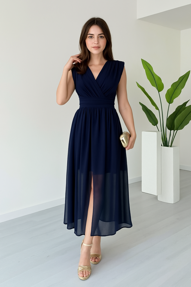 Kadın Vatkalı Şifon Kolsuz Kruvaze Yaka Yırtmaç Detaylı Şık Midi Elbise