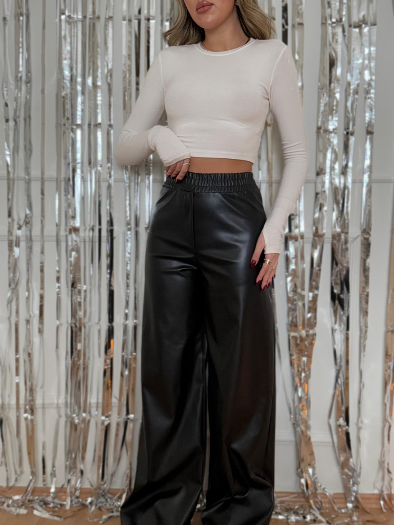Kadın Yüksek Bel Beli Lastikli Geniş Paçalı Deri Pantolon