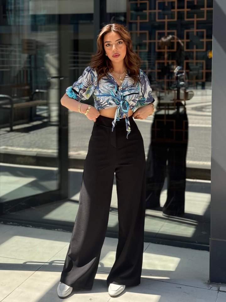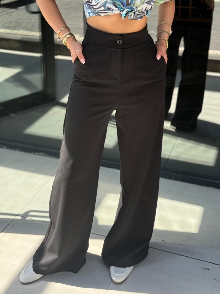 Kadın Yüksek Bel Geniş Paça Detaylı Cepli Ithal Krep Pantolon