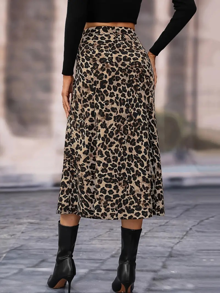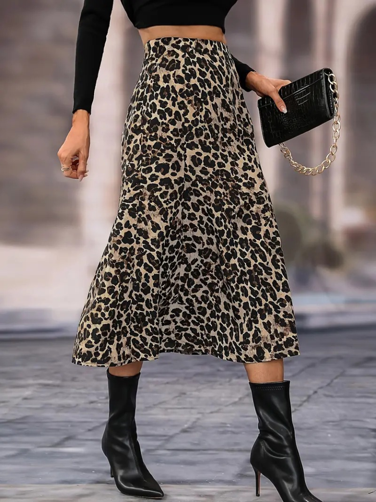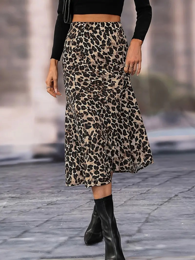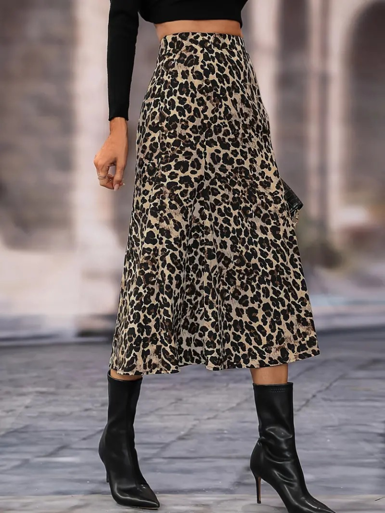 Kadın Yüksek Bel Leopar Desenli Midi Krep Etek