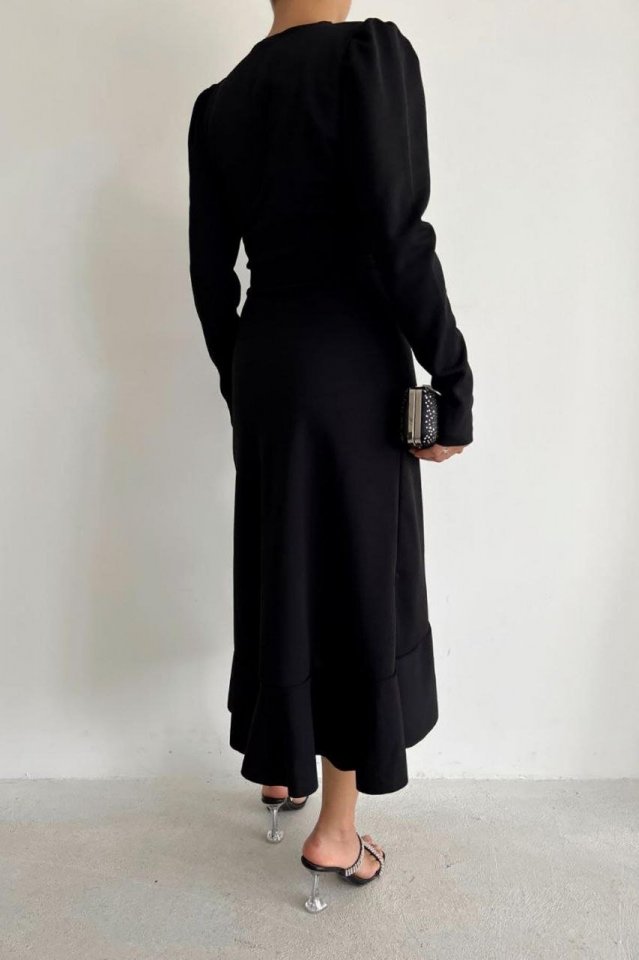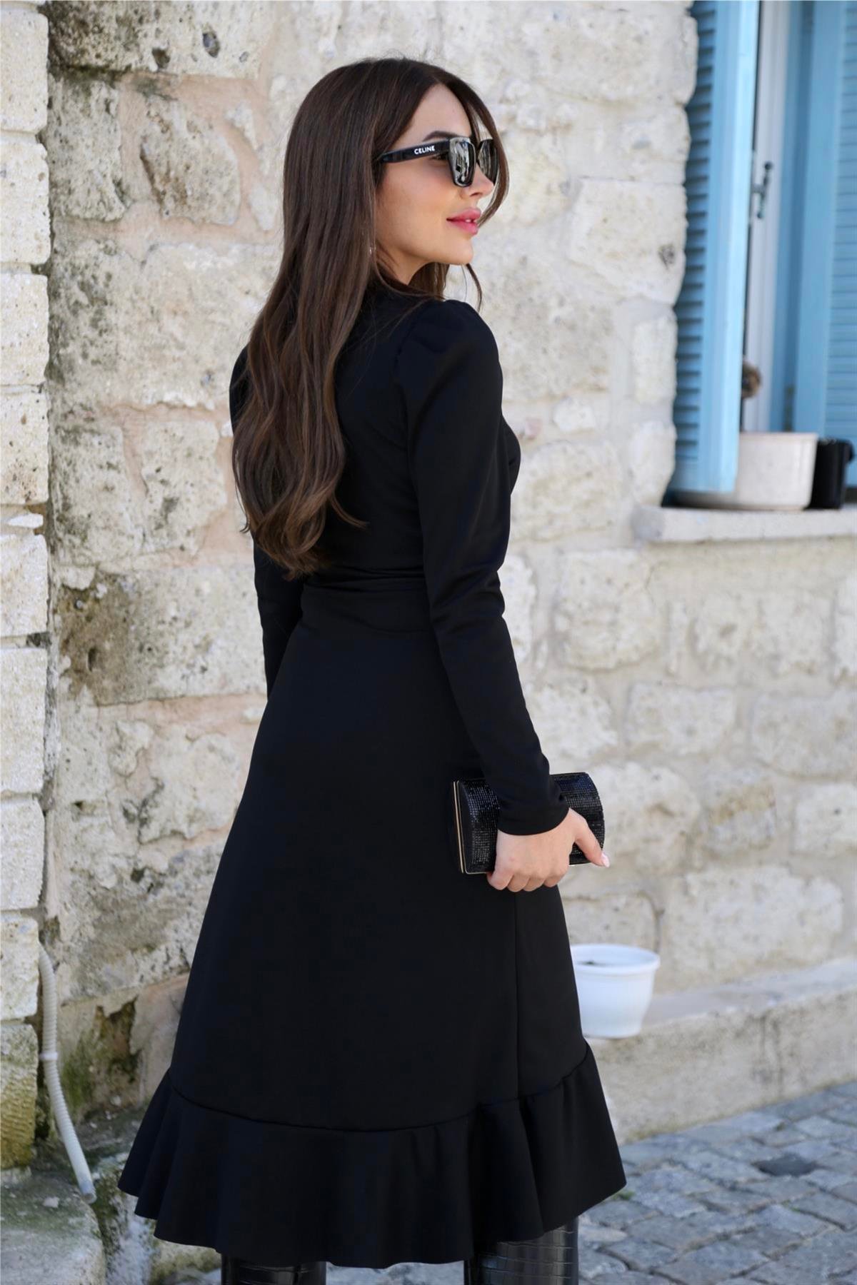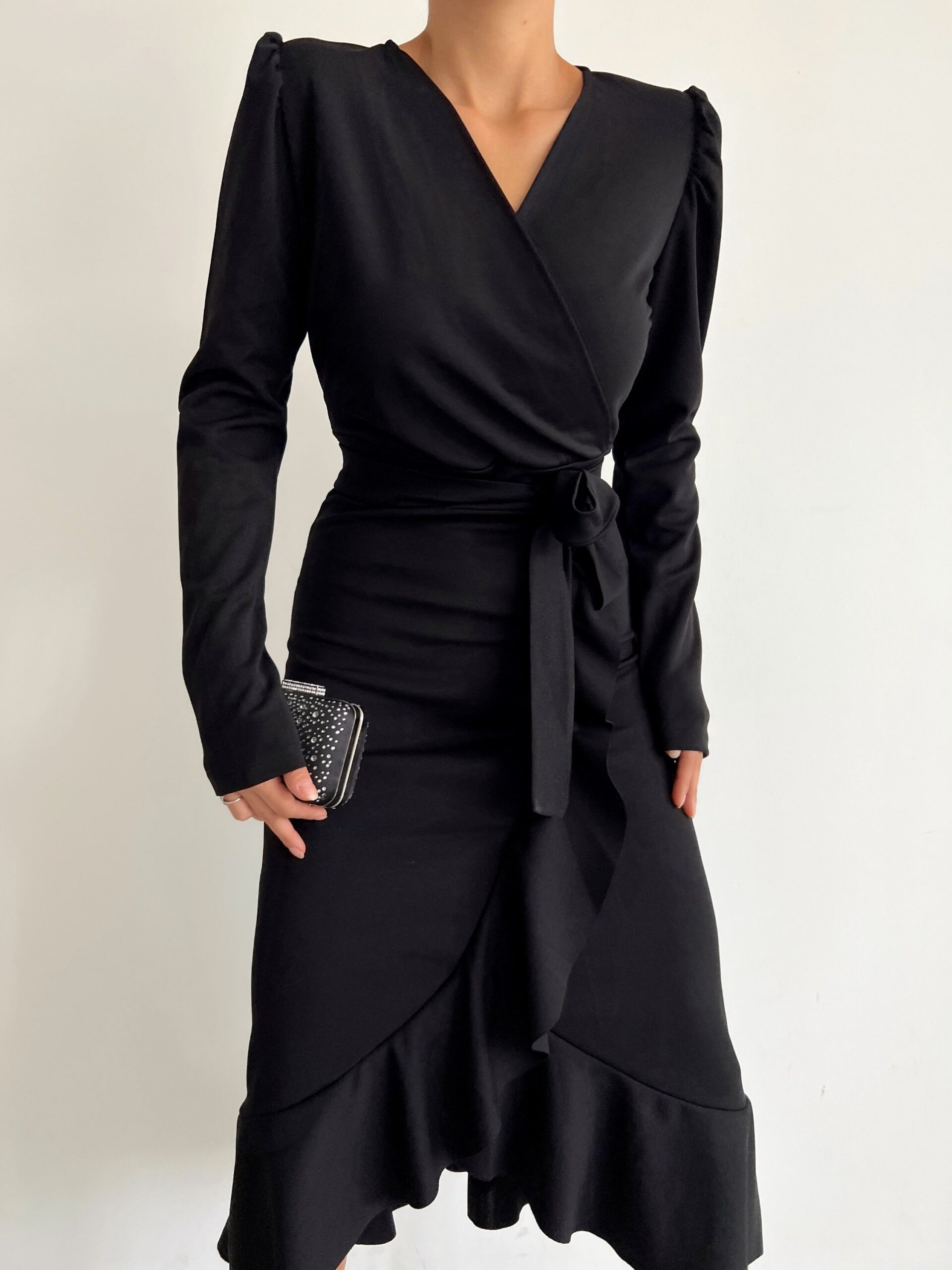 Krep Kumaş Midi Boy Kuşaklı Uzunkol Elbise 113 Cm