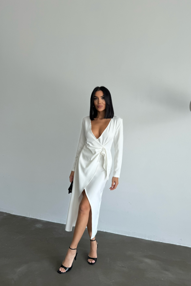 KRUVAZE BROŞ DETAYLI ELBİSE – Beyaz