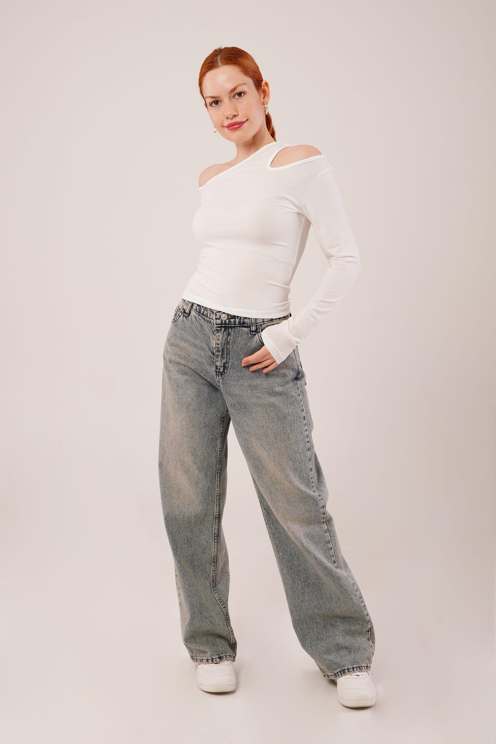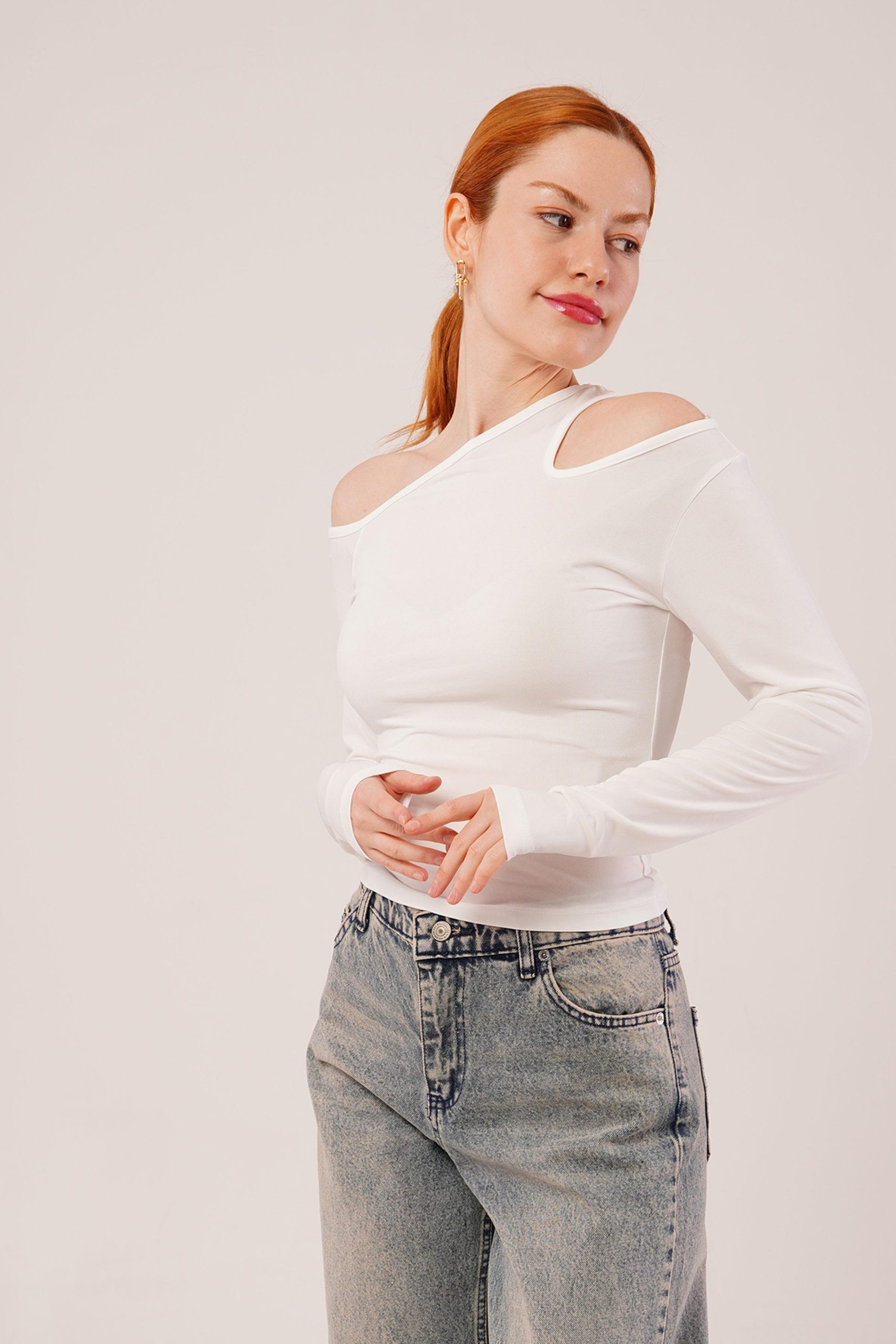 Omuz Dekolte Detaylı Beyaz Bluz