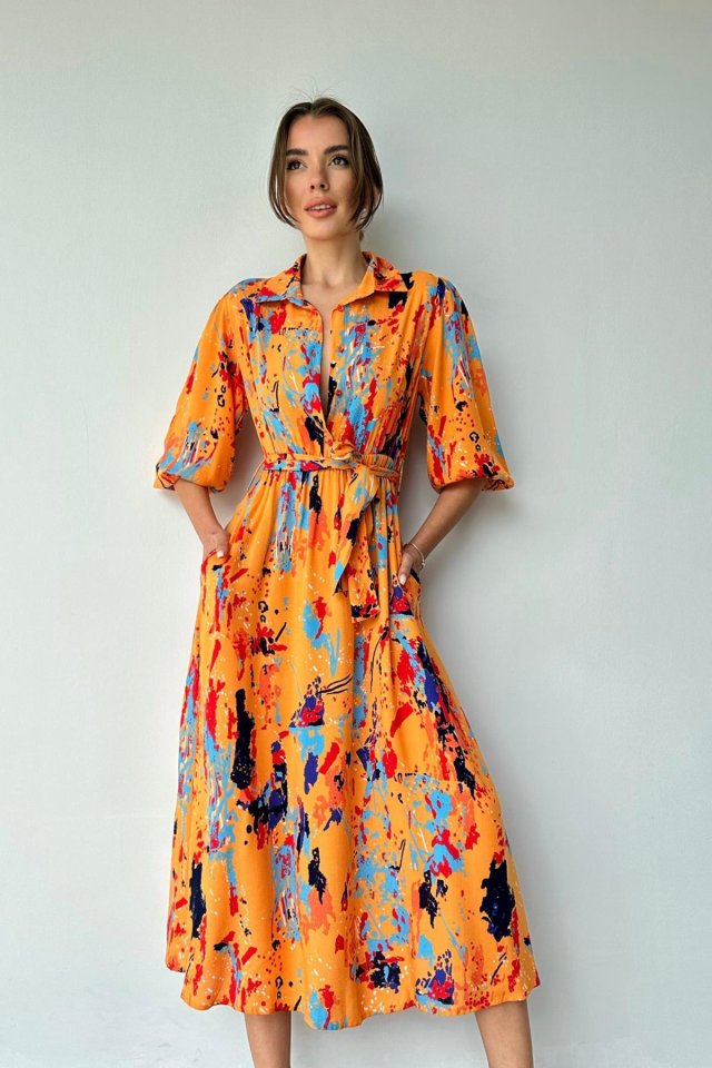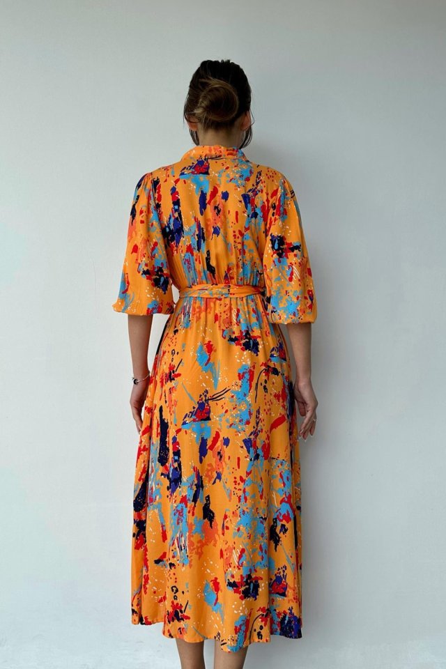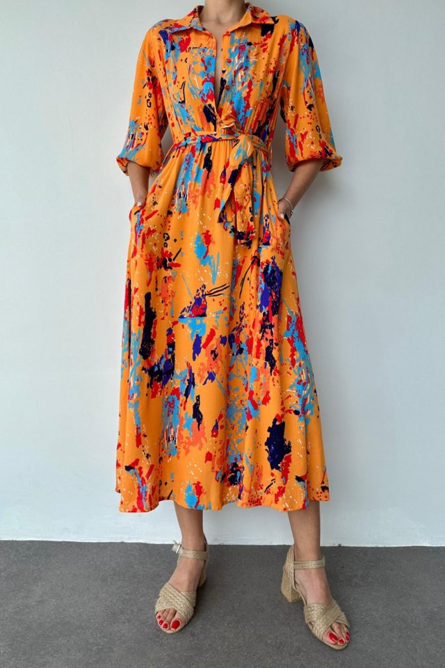 Oranj Çiçek Desenli Kemerli Elbise