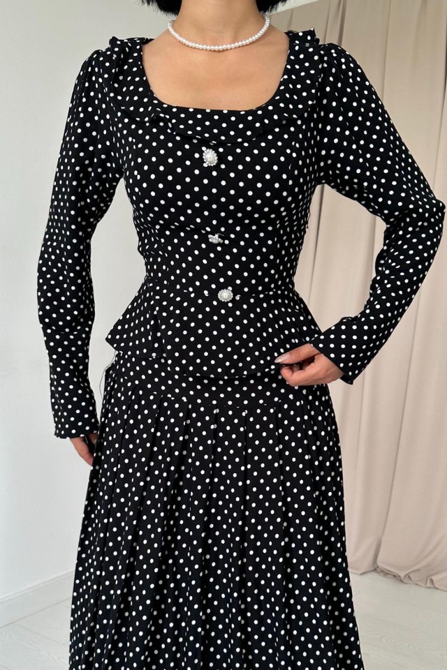 Siyah Puantiye Desenli Volanlı Elbise