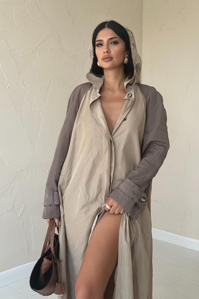 Taba Kapüşonlu Uzun Trençkot