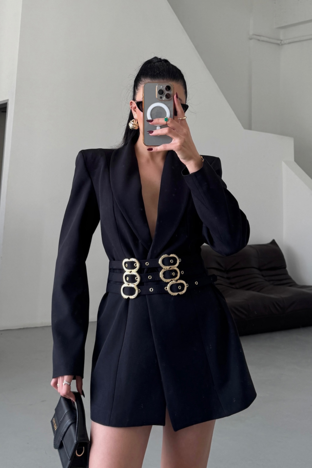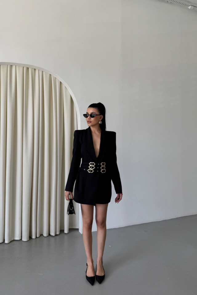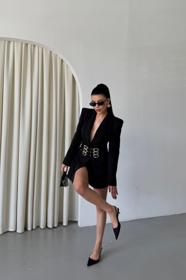 TEK DÜĞME CEKET 3 TOKALI KEMER SÜSLÜ – Siyah