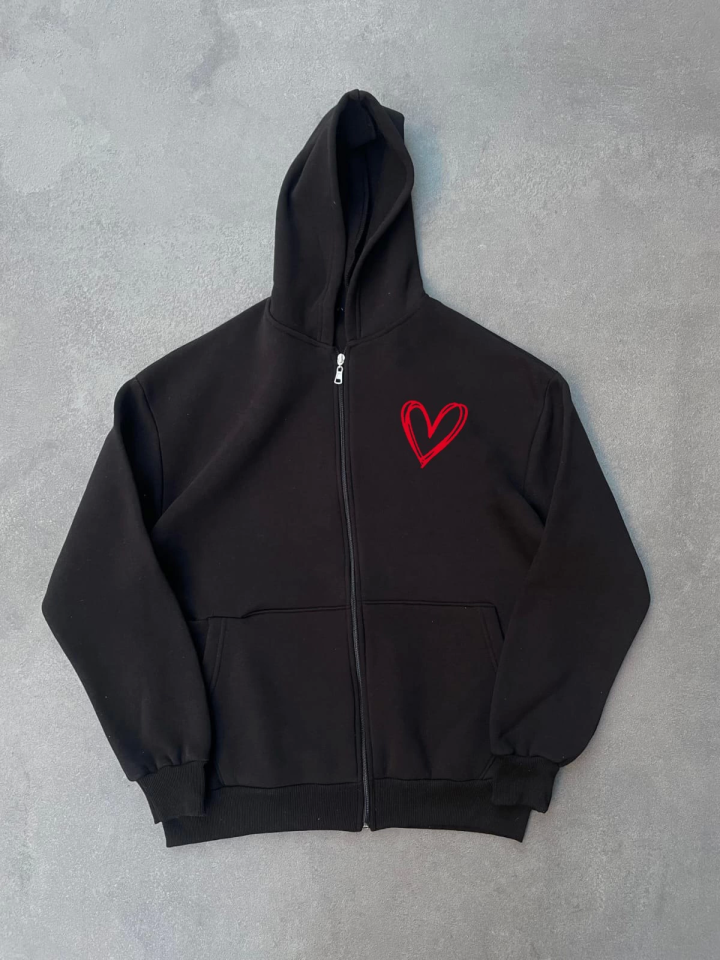 Üç İplik Baskılı Fermuarlı Kapşonlu Hırka – Siyah