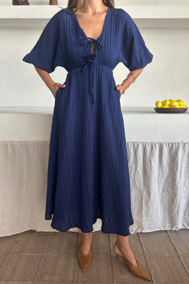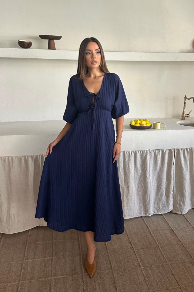 V YAKA DÖKÜMLÜ ELBİSE – Lacivert