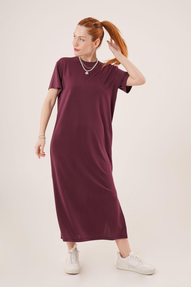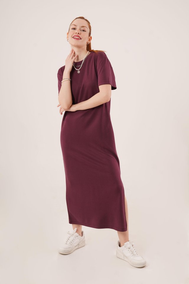 Yırtmaç Detaylı Kısa Kollu Salaş Maxi Bordo Elbise